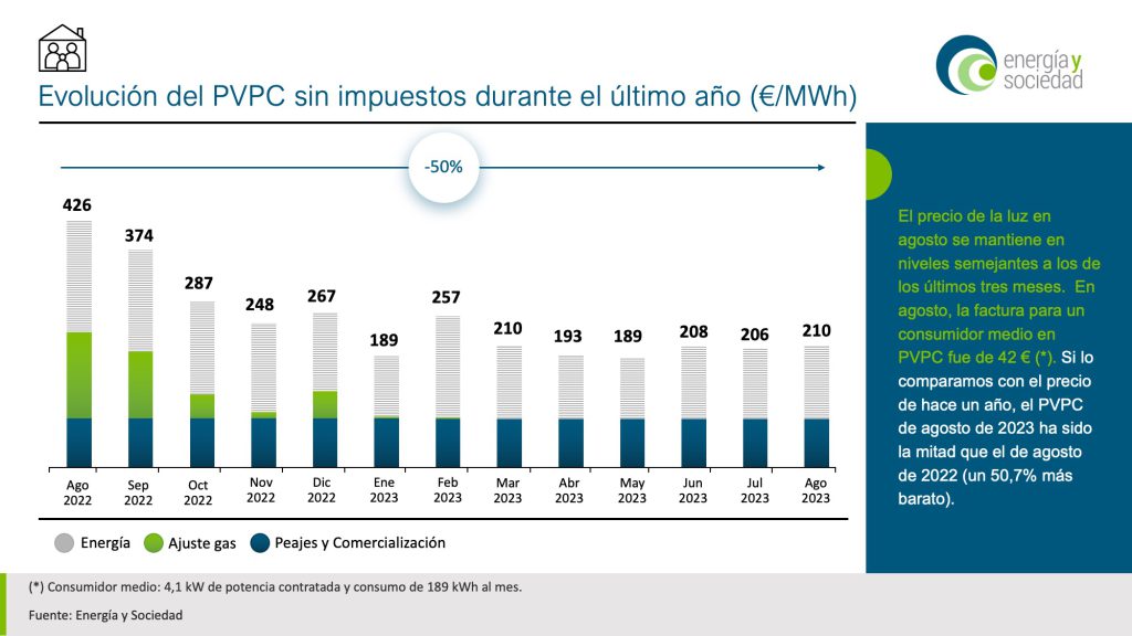 El precio de la luz en agosto se mantiene en niveles semejantes a los de los últimos tres meses. En agosto, la factura para un consumidor medio en PVPC fue de 42 € (*). Si lo comparamos con el precio de hace un año, el PVPC de agosto de 2023 ha sido la mitad que el de agosto de 2022 (un 50,7% más barato).