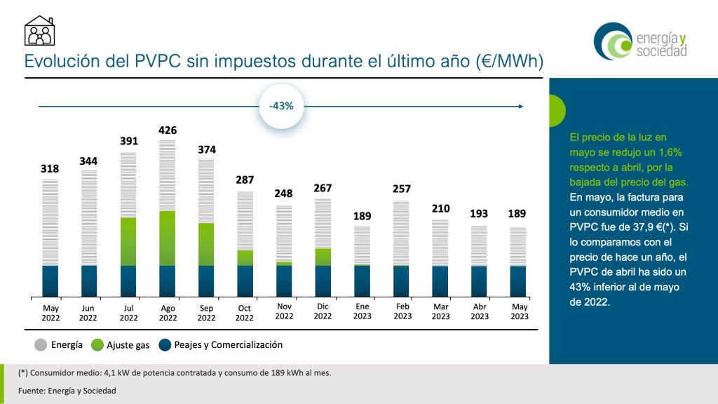 El precio de la luz en mayo se redujo un 1,6% respecto a abril, por la bajada del precio del gas. En mayo, la factura para un consumidor medio en PVPC fue de 37,9 €(*). Si lo comparamos con el precio de hace un año, el PVPC de abril ha sido un 43% inferior al de mayo de 2022.