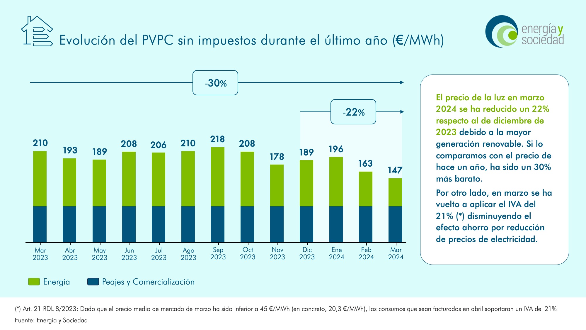 El precio de la luz en marzo se ha reducido un 22% respecto al de diciembre de 2023, debido a la mayor generación renovable. Si lo comparamos con el precio de hace un año, ha sido un 30% más barato. Por otro lado, en marzo se ha vuelto a aplicar el IVA del 21% (*) disminuyendo el efecto ahorro por reducción de precios de electricidad.