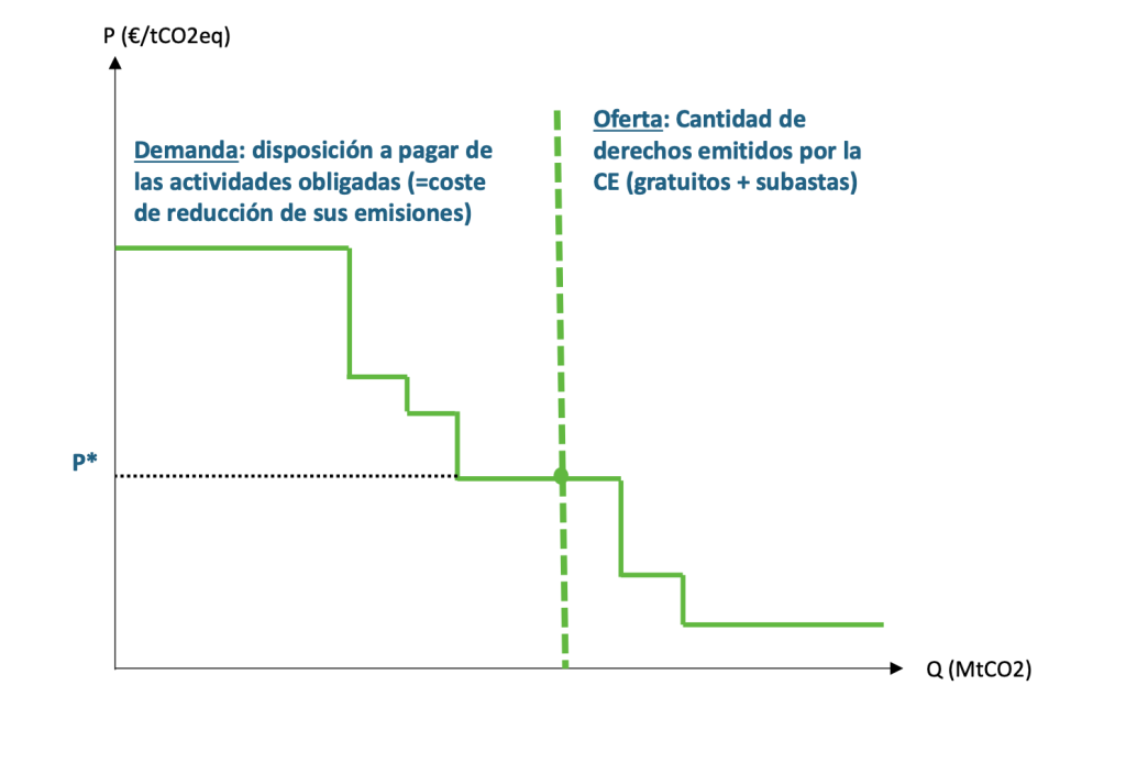 Tal y como se observa en la Figura 3-¿?, el precio de los derechos de emisión queda determinado por la intersección entre las curvas de oferta y demanda de derechos; es decir, por la disposición a pagar por los derechos (o su coste de reducción de 1 tonelada de CO2) por parte de la última instalación necesaria para cumplir con el tope de emisiones establecido para cada año.
