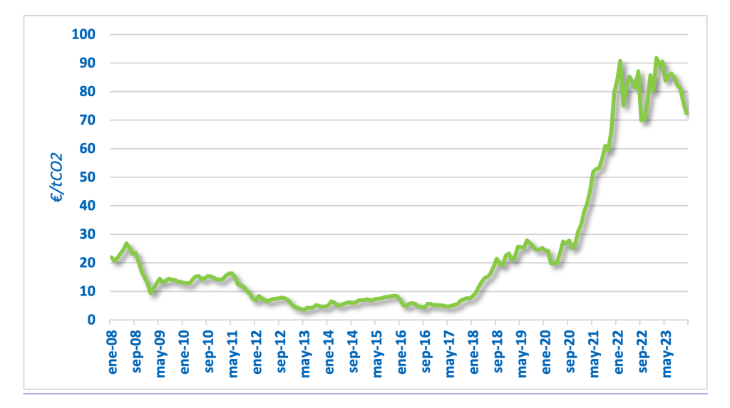 La Figura 3-¿? recoge la evolución del precio de los derechos de emisión entre enero de 2008 y diciembre de 2023: