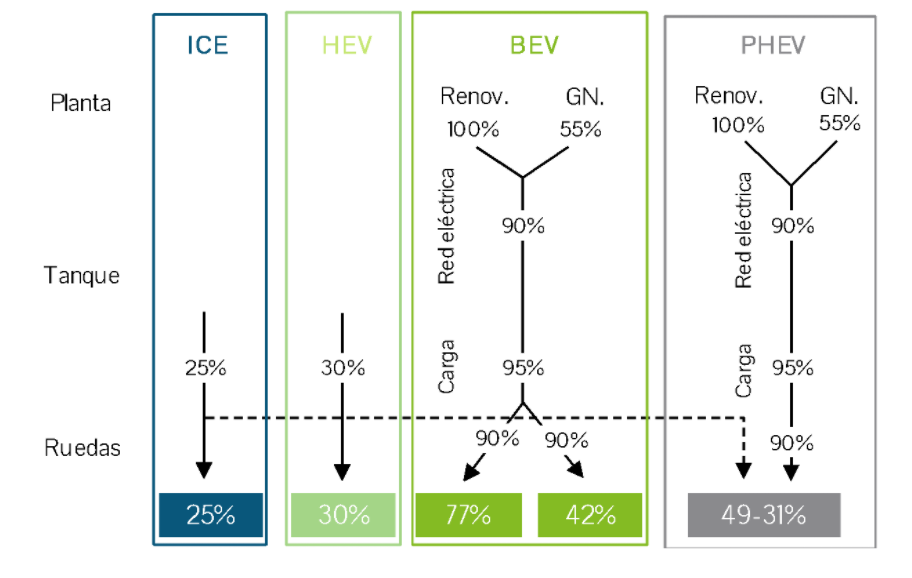 Figura 4-3. Análisis de la eficiencia en el “Tanque-ruedas” (ICE, HEV) y “Planta-ruedas” (parte eléctrica del PHEV y BEV).