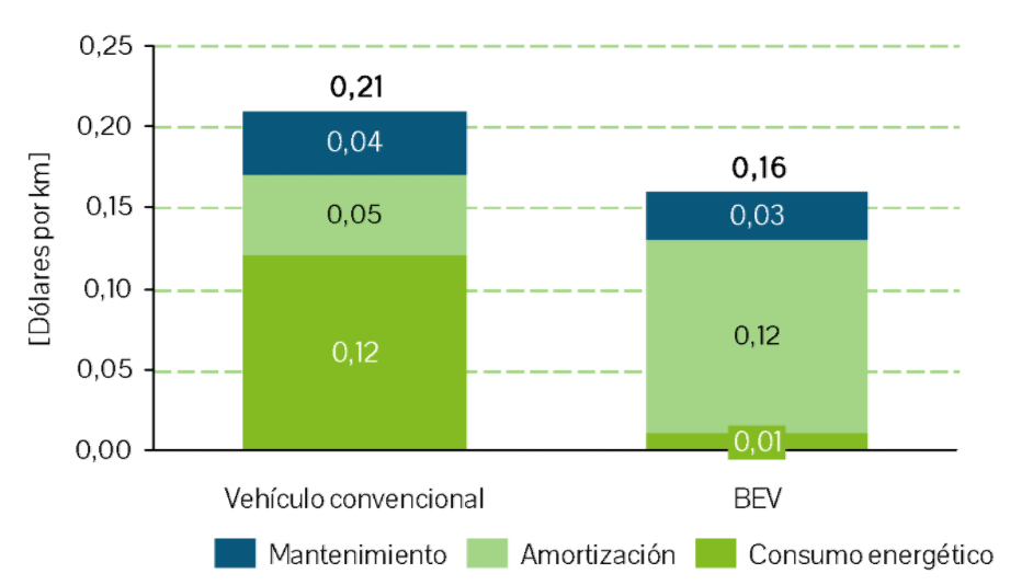 Considerando unos costes de mantenimiento en el entorno de los incluidos en el informe de McKinsey, se puede observar en la Figura 4-5 que el coste total por kilómetro es muy superior en los vehículos convencionales que en los BEV.
