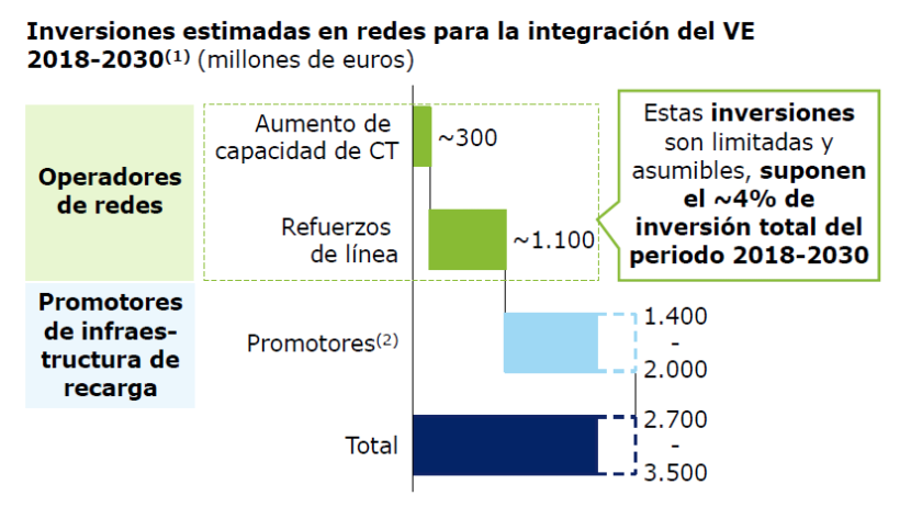 Desde el punto de vista de los promotores de recarga (despliegue en infraestructuras urbanas y de puntos en corredores), se estima que las inversiones necesarias alcanzarán una horquilla de unos 1.400 a 2.000 millones de euros.