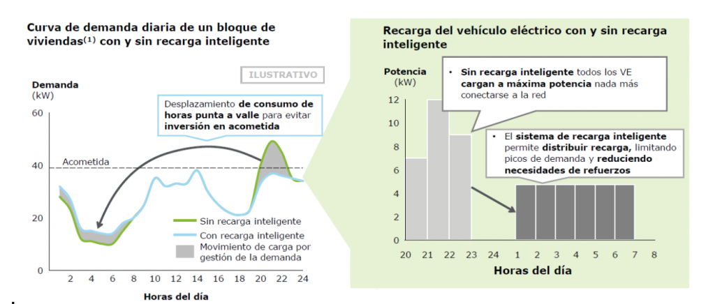 Esta recarga inteligente es una oportunidad desde el punto de vista del cliente (recarga en los momentos del día con costes más bajos), así como desde el punto de vista de las redes (reducción de las inversiones en aumento de centros de transformación y refuerzo de líneas).